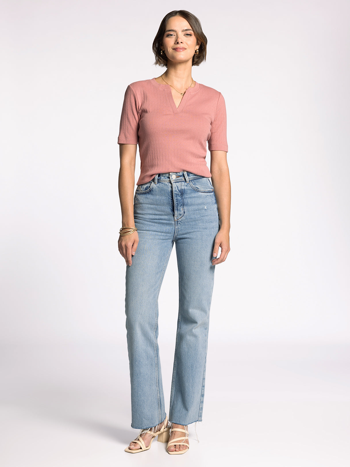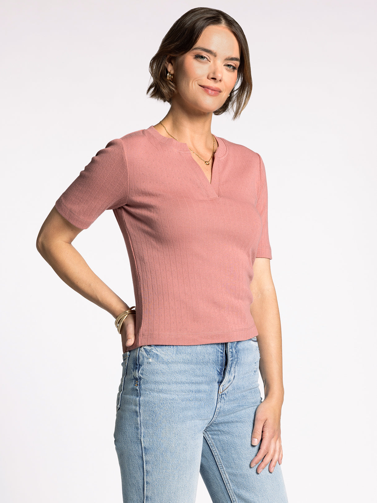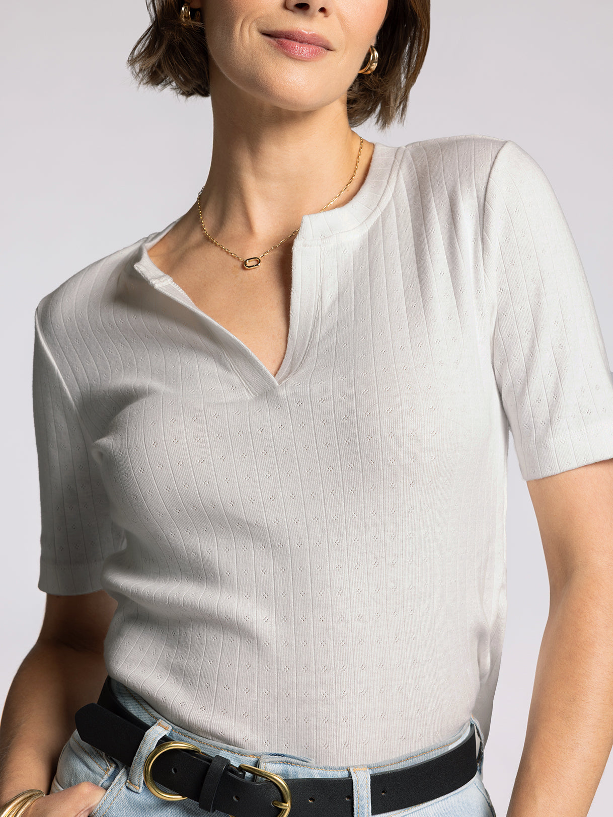 Delicate and darling, this twist on a classic tee is featuring a soft pointelle fabric, v neckline and relaxed fit.