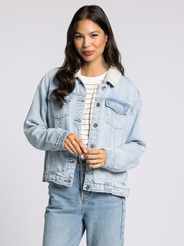 So essential to your outerwear collection, this so-soft denim jacket is featured in the perfect washed denim with a sherpa collar for an extra touch of detail.
