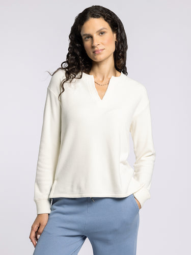 Sleek, soft, and perfect for layering, this long-sleeve top features a v-neckline and short side slits for added comfort and versatility.