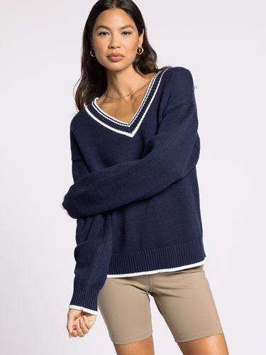 Its relaxed fit and drop shoulders make this layer perfect for chilly days ahead featured in a wide v neckline and ribbed hem details.