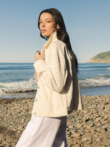 Eyelet details throughout give this relaxed denim jacket the perfect dose of style. Featuring a drop shoulder silhouette, dual side pockets and button up front.