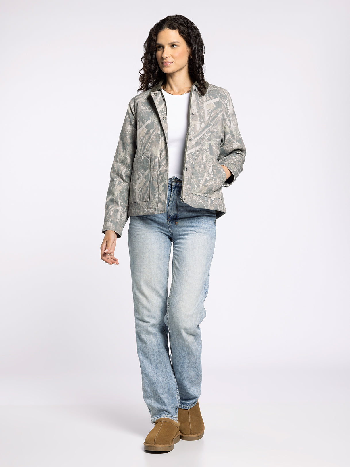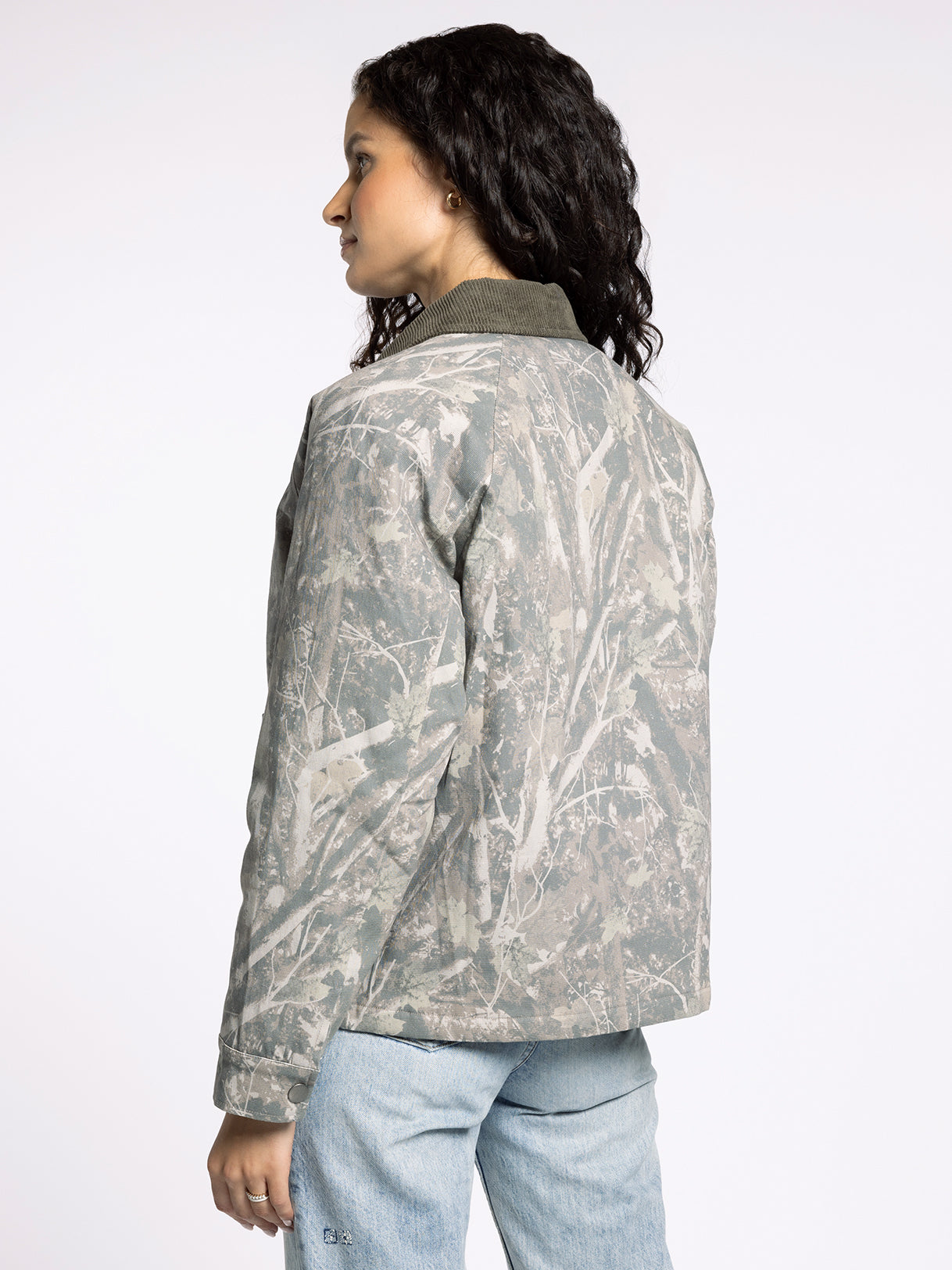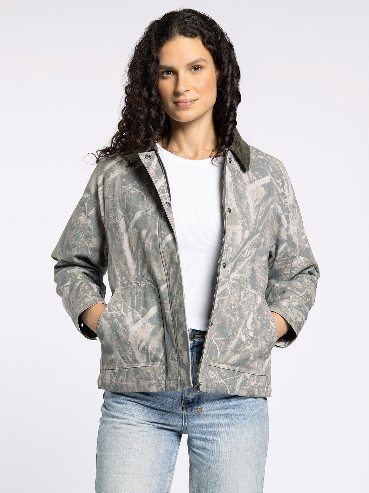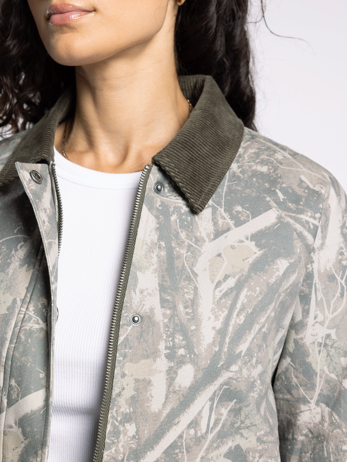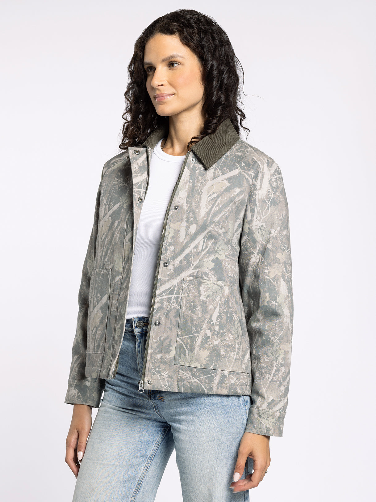 Add a timeless layer to any outfit with this camo print barn jacket, featuring a boxy silhouette, a classic cord collar, and heritage-inspired details for a tailored look.