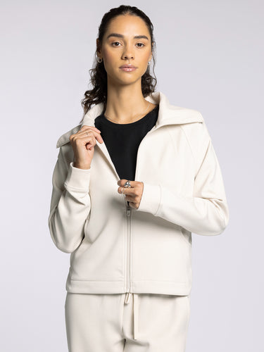 Layer up in this easy jacket, cut in a relaxed silhouette perfect for throwing over your workout fit. Front zipper is complete with an oversized collar, side pockets and drop shoulder fit.
