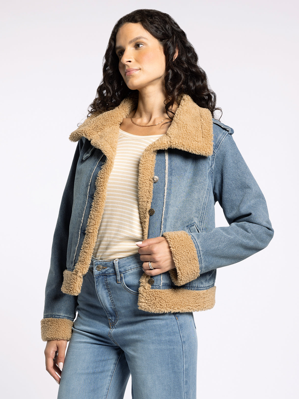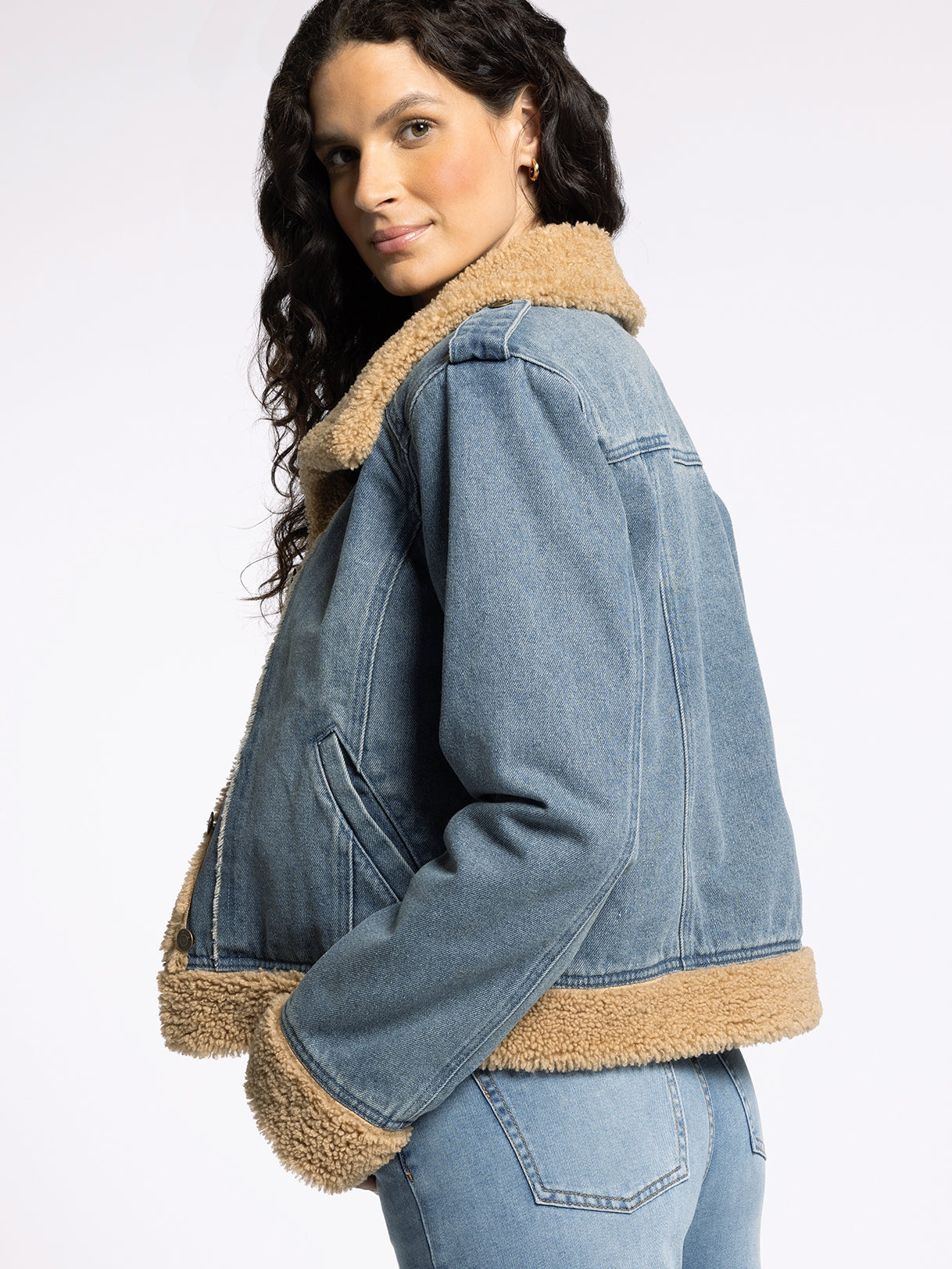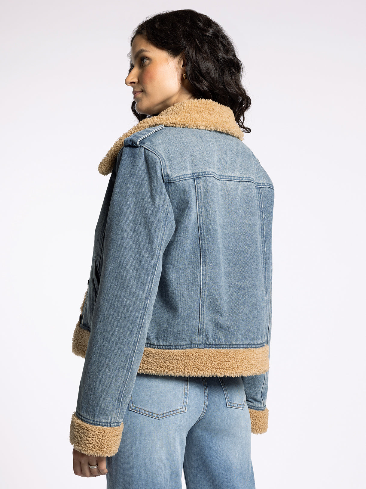 The iconic denim jacket gets a warm upgrade, featuring a sherpa collar, a loose, relaxed fit, and an ultra-soft denim fabrication.