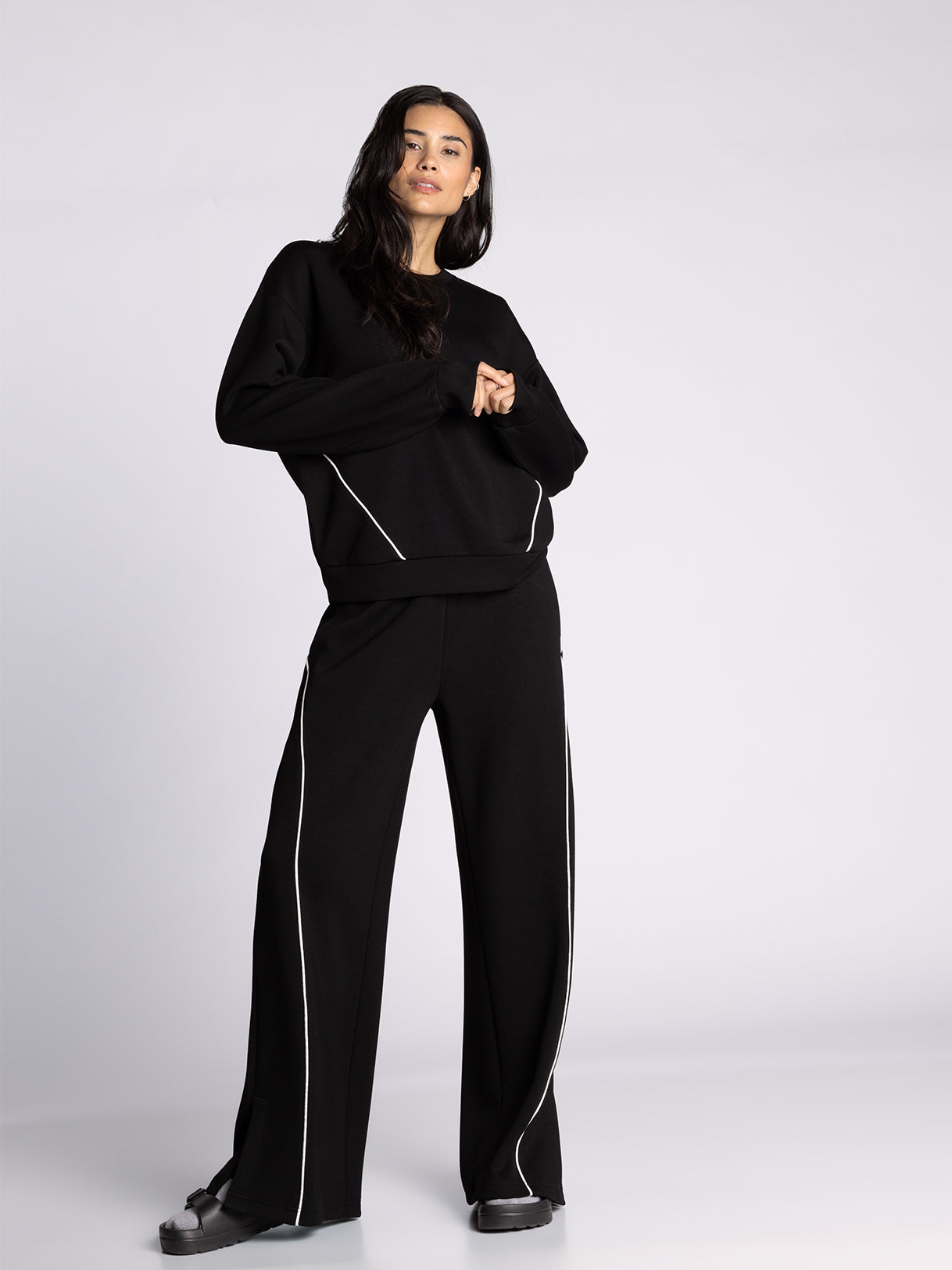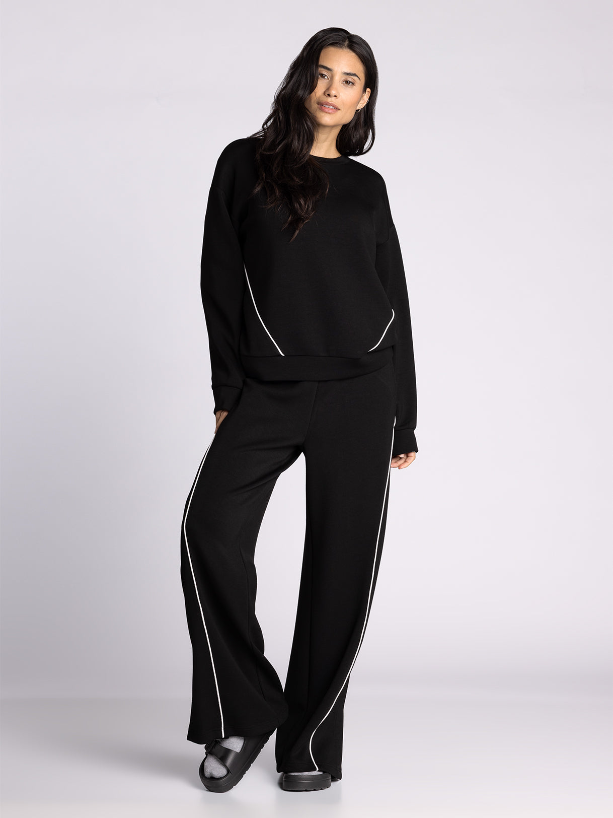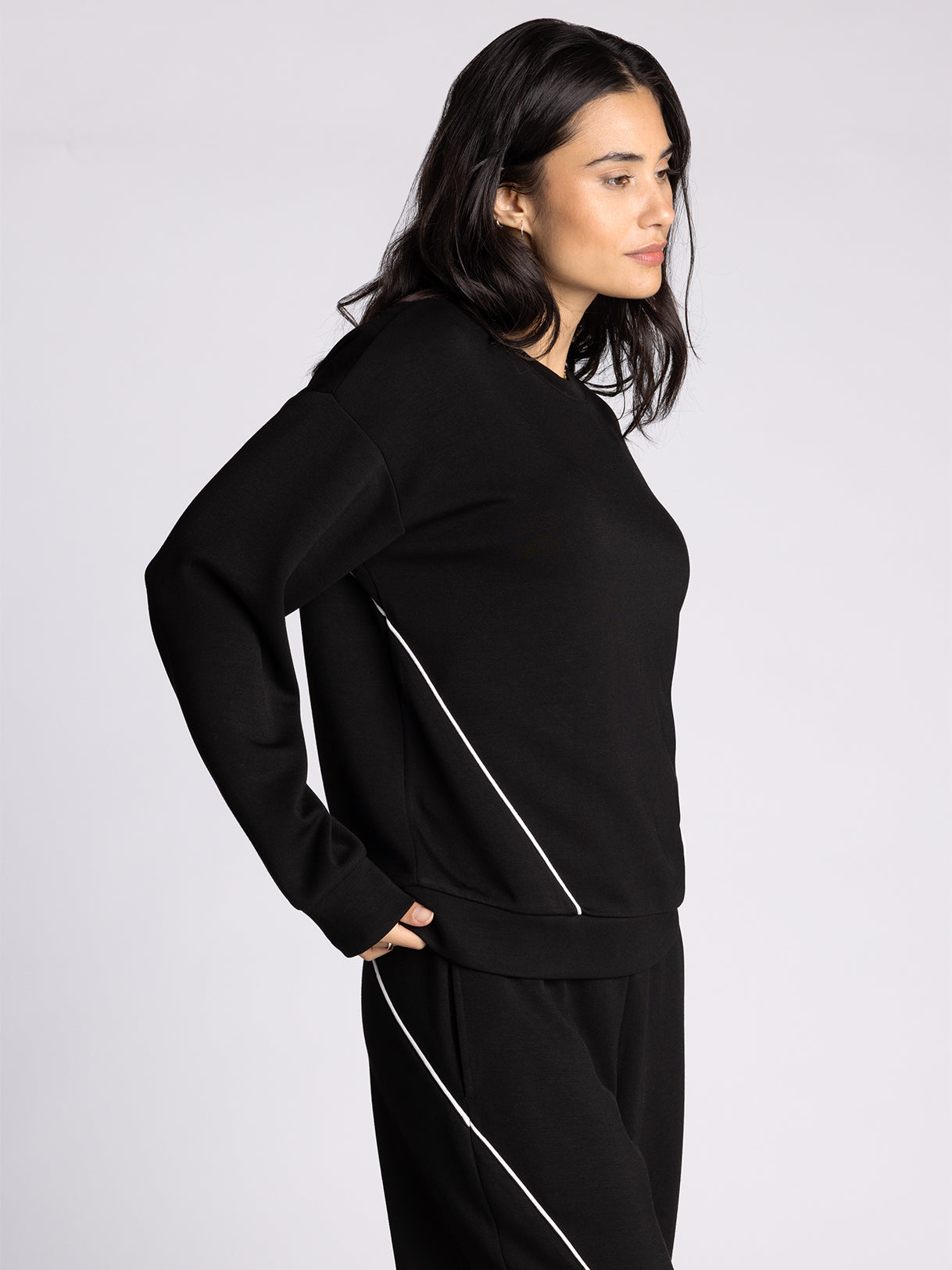 Made for easy layering, this buttery soft top is the perfect throw-on for casual comfort. Featured with contrast piping details for a sporty touch and drop shoulder for a relaxed fit. Make it a set with the Britney Pant.