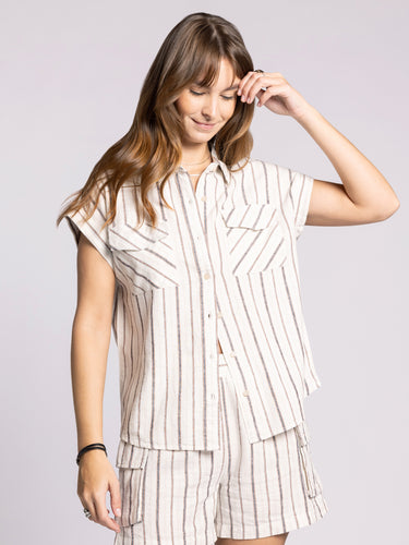 This easy linen button up is perfect for the summer breeze, featured with dual chest pockets and cap sleeves. Wear with the Darana Shorts to complete the set.