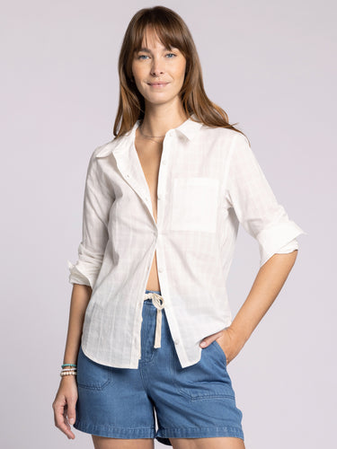 A twist on a classic, this staple button-down is crafted from crisp cotton and designed in a unique textured grid print—making it anything but ordinary, yet just as essential.