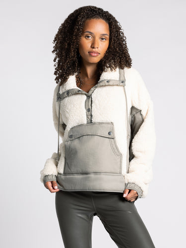 Essential for hitting the trail, this hike-ready puffer is featured in a soft sherpa fabrication and easy pullover style with a half button snap neckline and pouch pocket at the front.