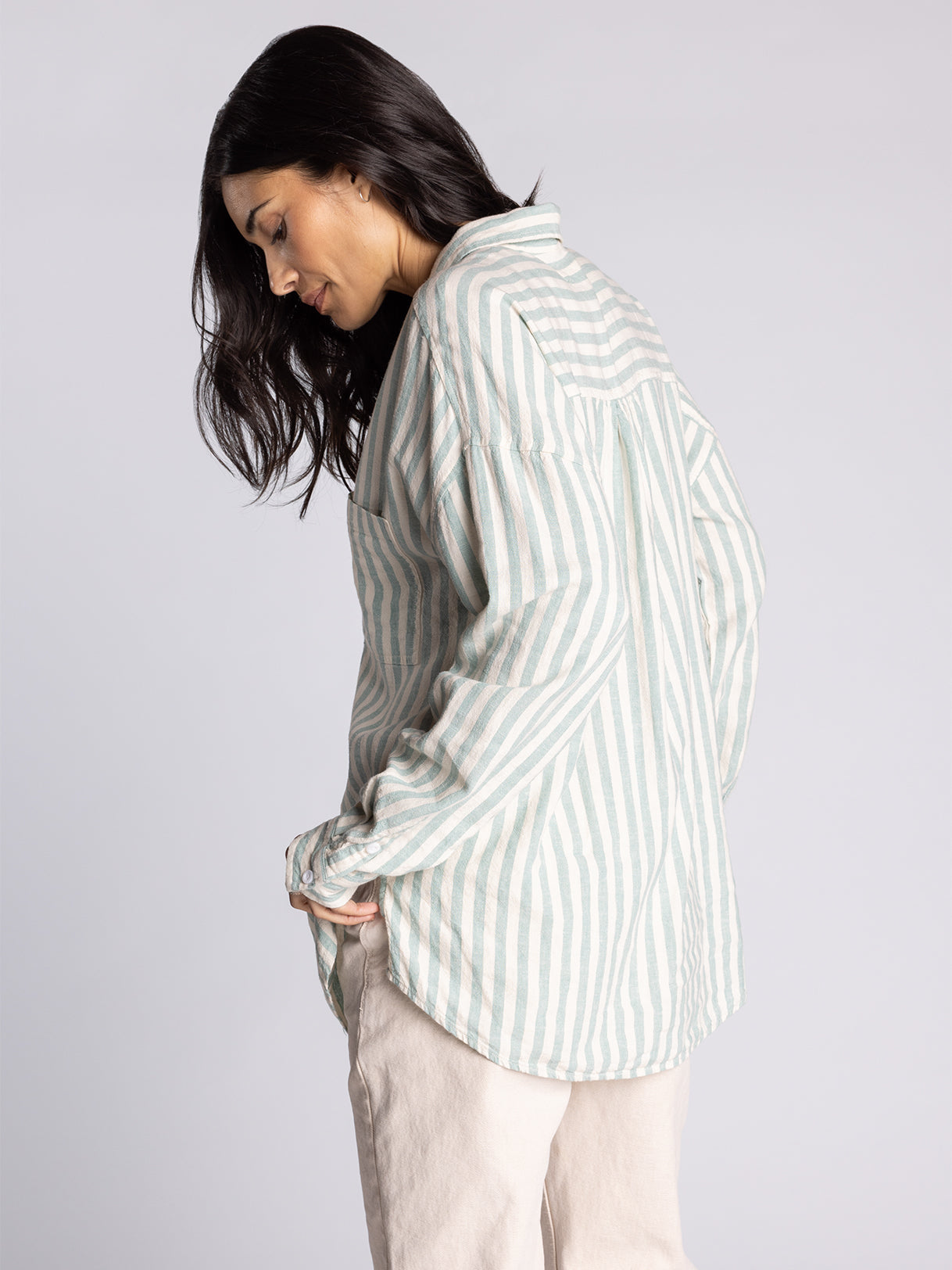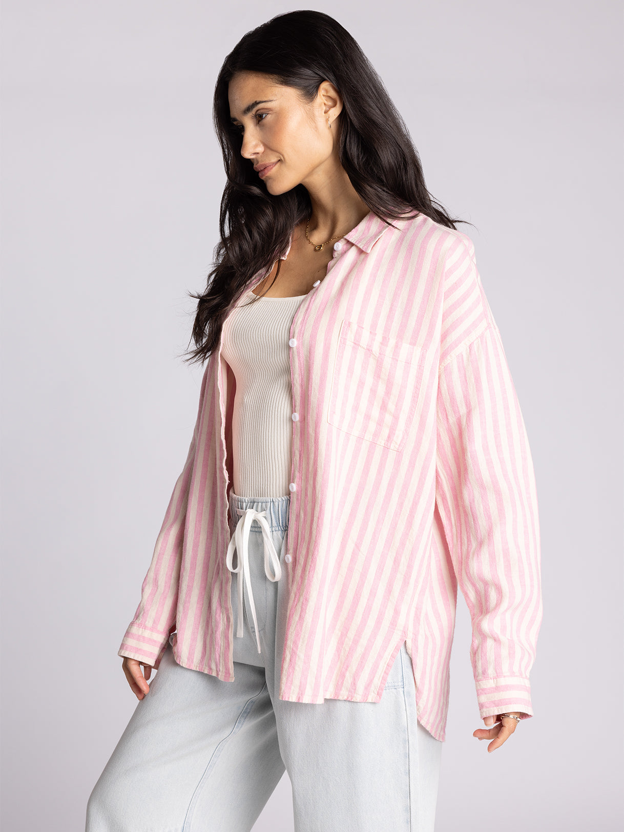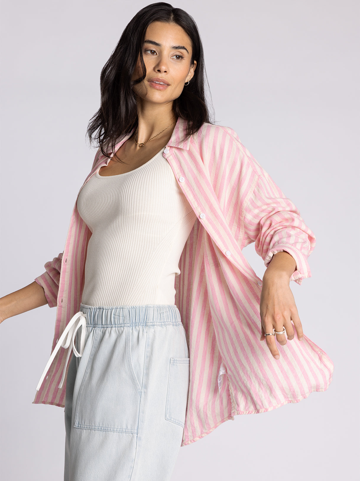The perfect button down from our Spring collection, this classic shirt is featured in a cool linen blend fabrication and relaxed fit with dropped shoulders and a collared neckline.