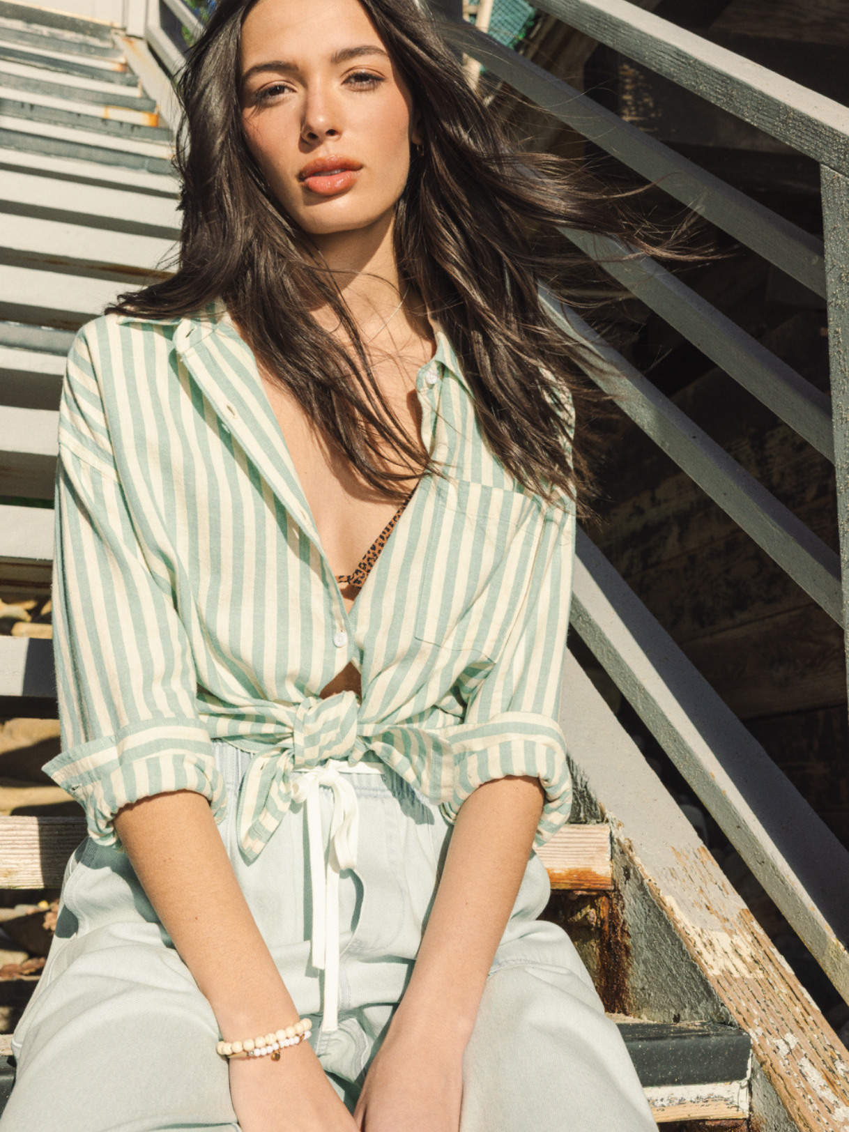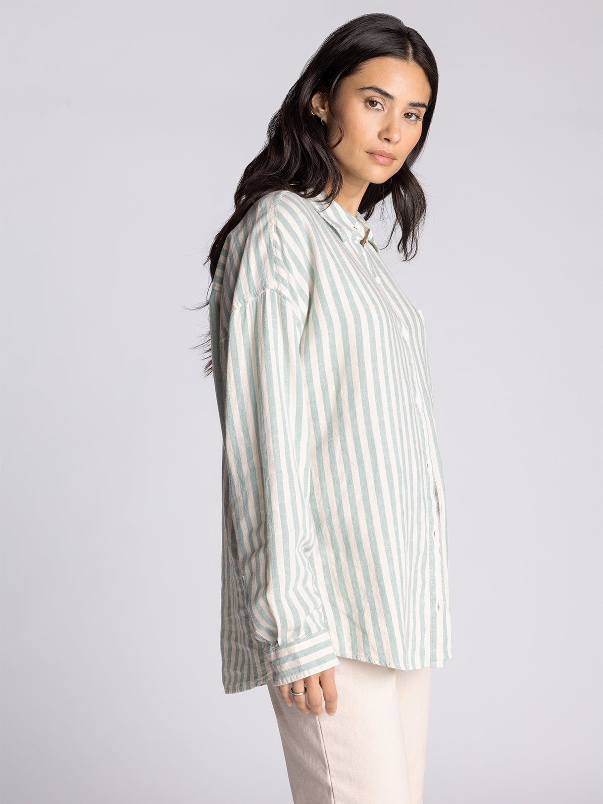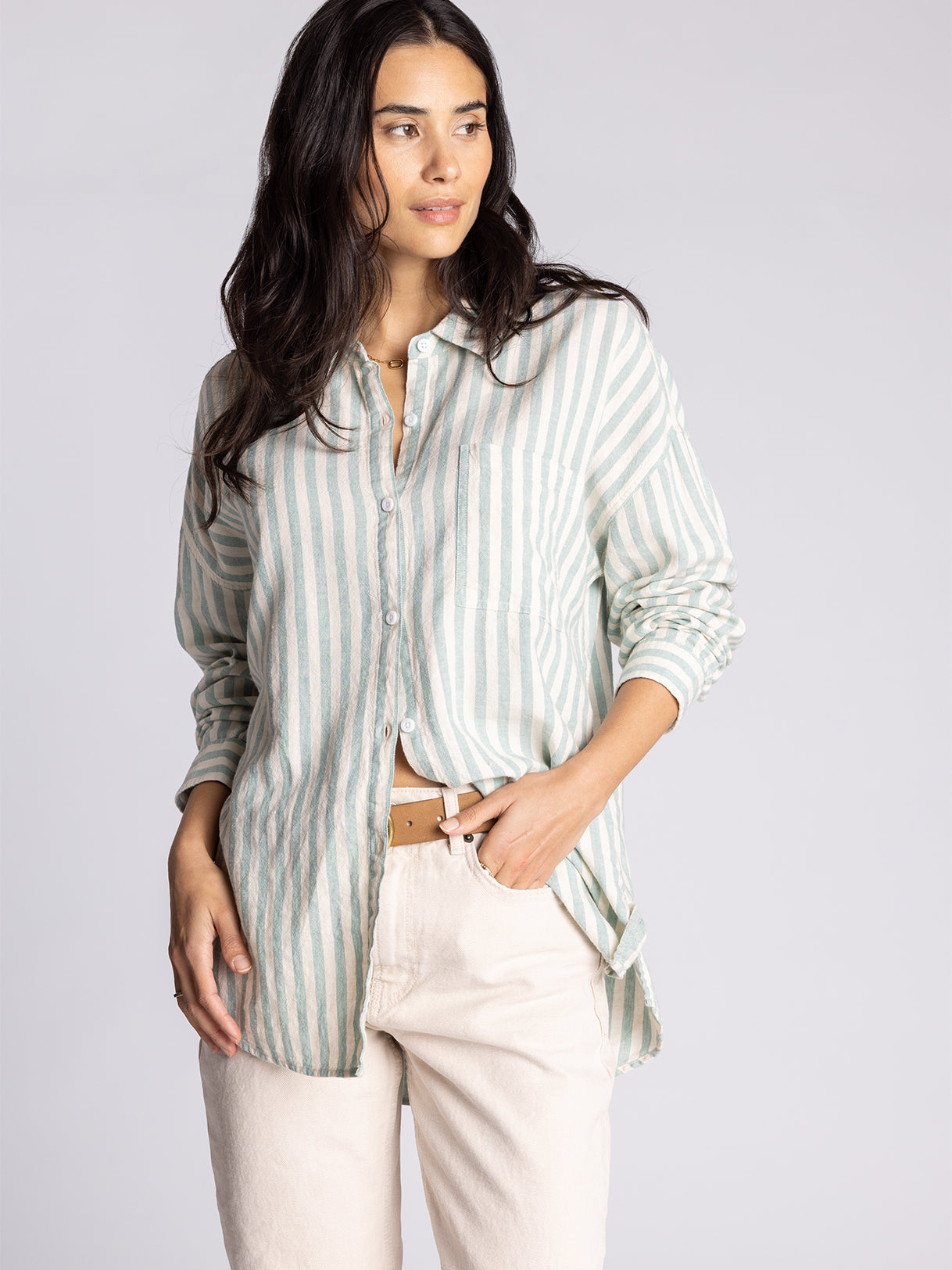 The perfect button down from our Spring collection, this classic shirt is featured in a cool linen blend fabrication and relaxed fit with dropped shoulders and a collared neckline.