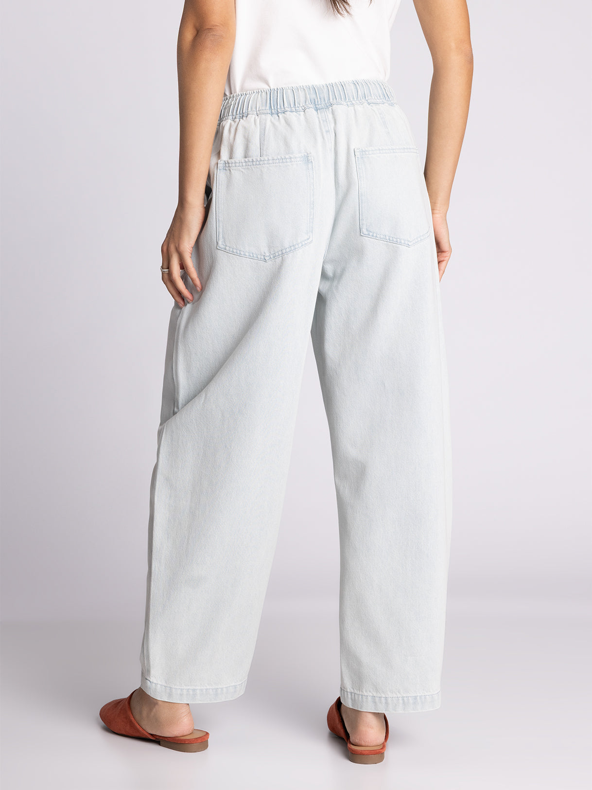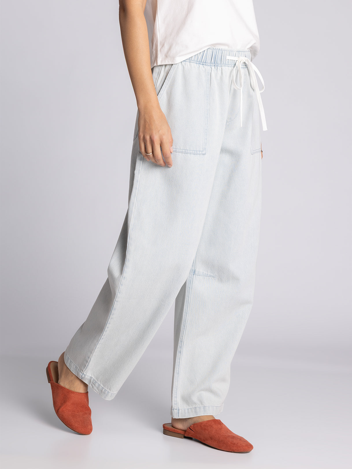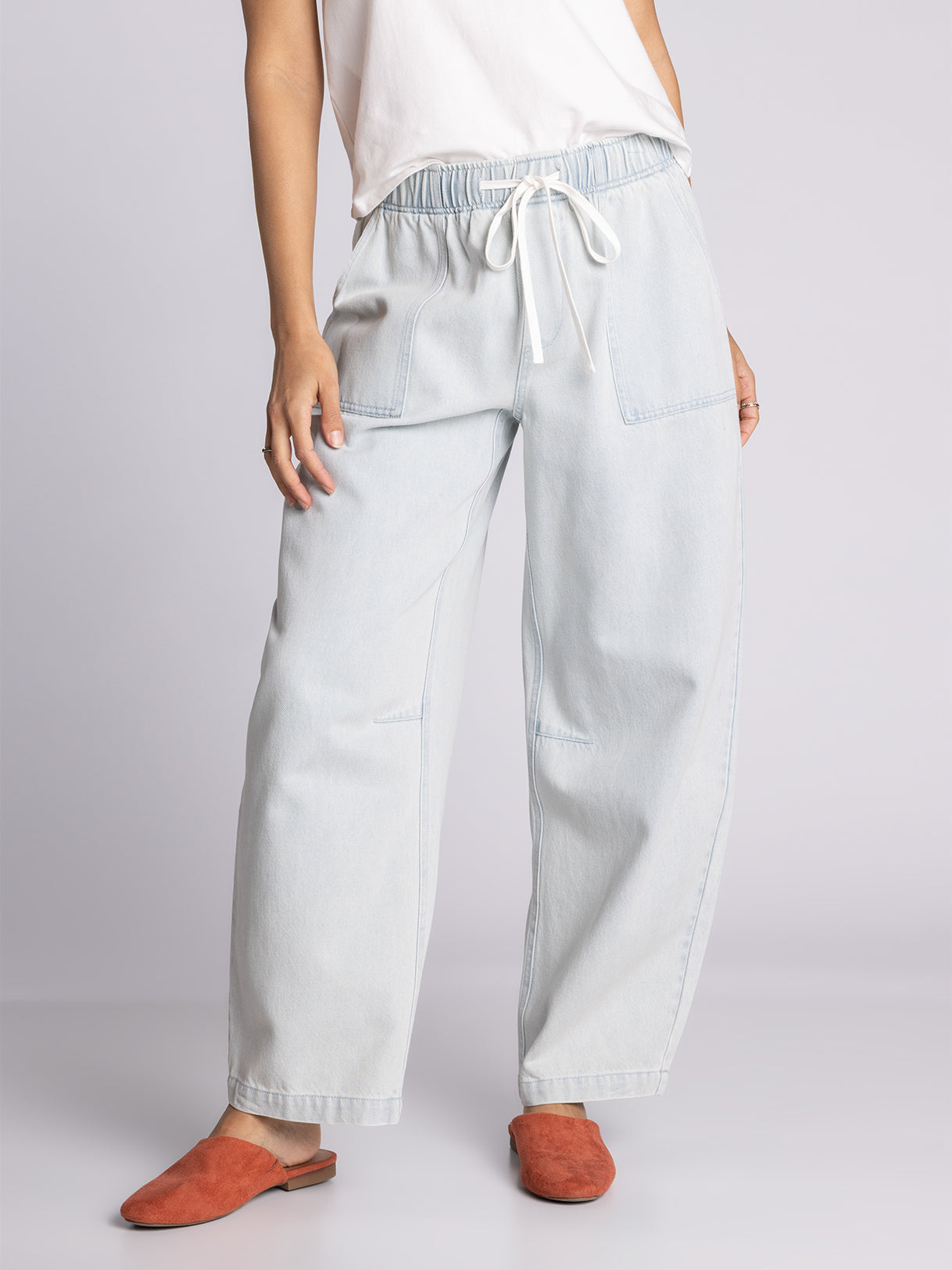 barrel leg silhouette, elastic waist and dual side pockets.