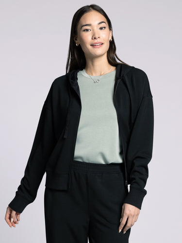 This so-soft hoodie is perfect to throw on, featured with an attached 3 panel hoodie, zip front closure and side pockets.
