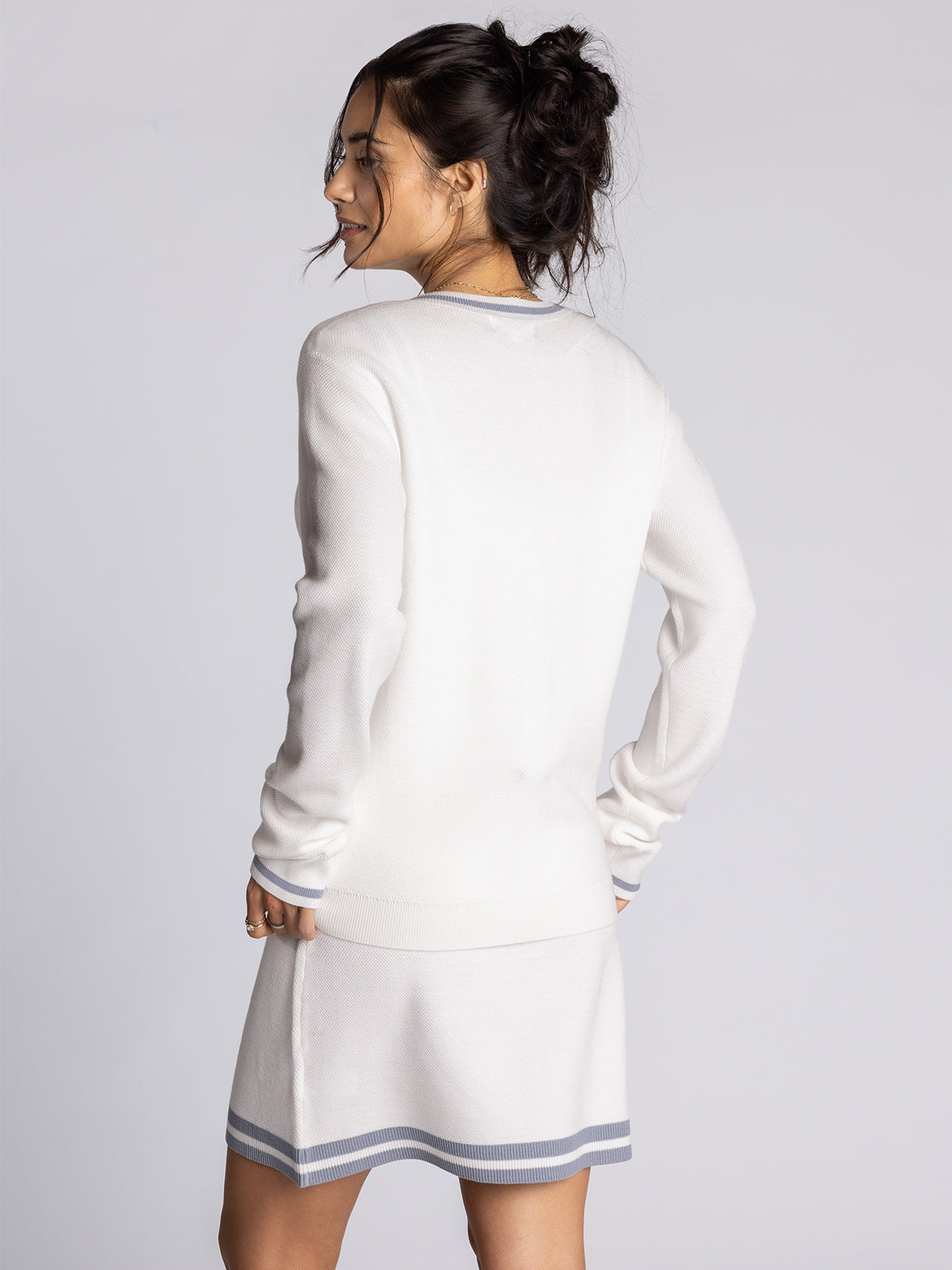 Not your grandpa’s cardigan: Cut in a fitted silhouette with a roomy drape, featured with dropped shoulders, ribbed cuffs, and a hip-length hem. Striped trim gives it a classic yet cute look.