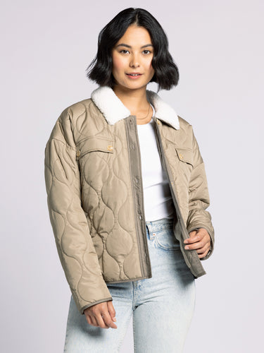 Sure to be your top layer to pair with any outfit, this goes-with-anything coat is featured in a quilted puffer, drop shoulder fit with contrast sherpa collar for added dimension and style.
