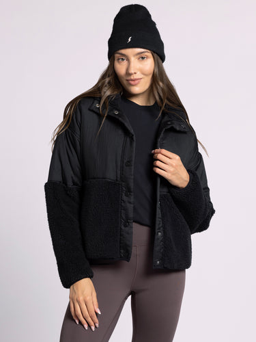The perfect versatile layer featured in a mix fabric combo, top half is nylon, bottom half is faux sherpa, and the body is lined in a soft jersey.