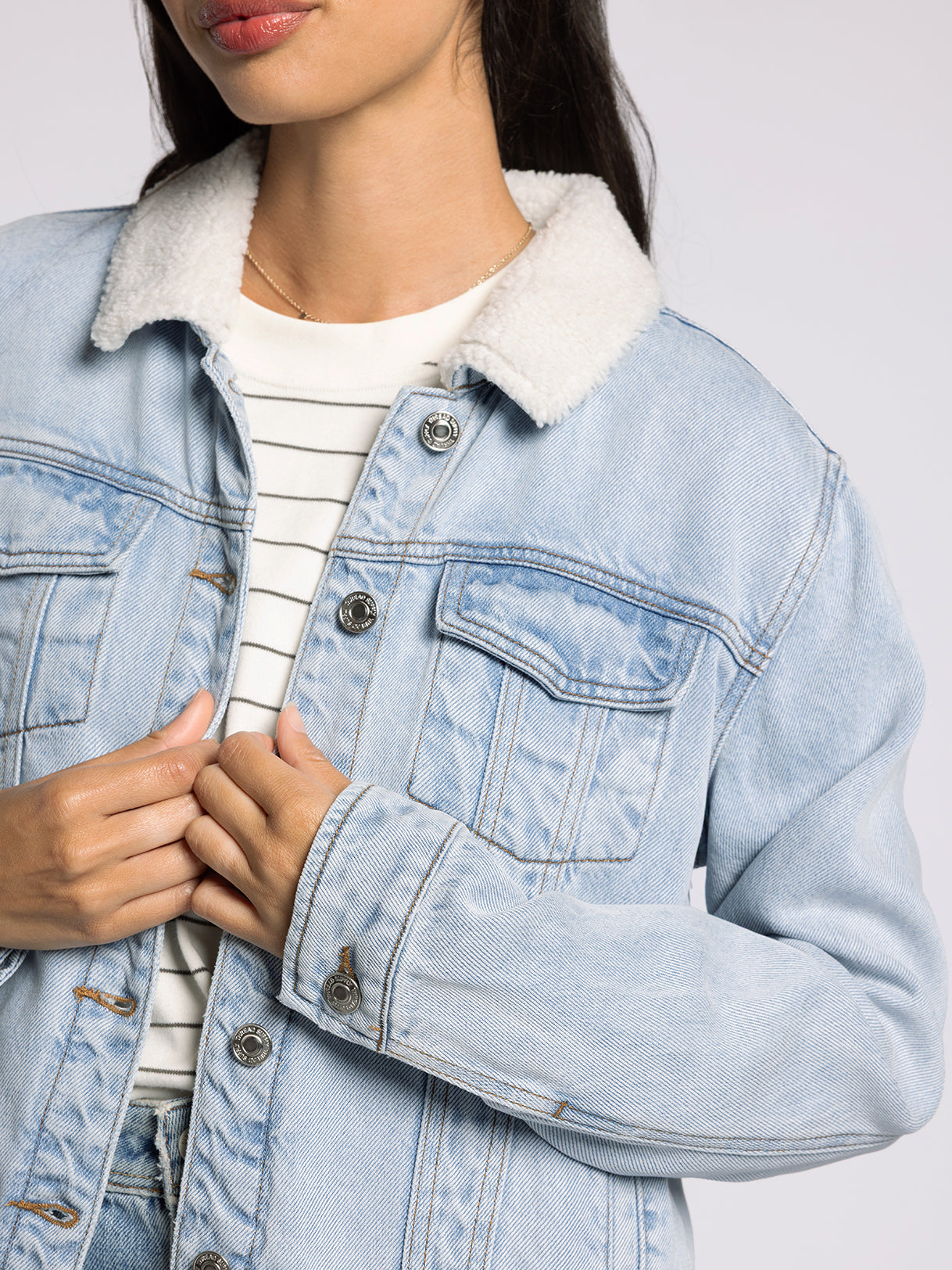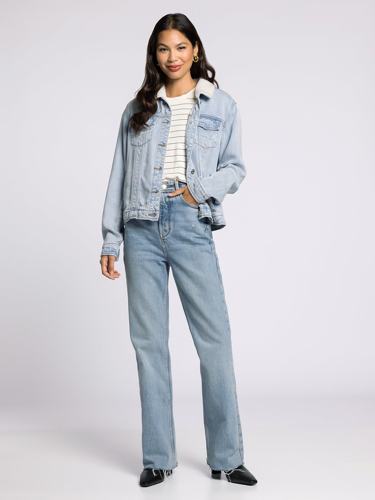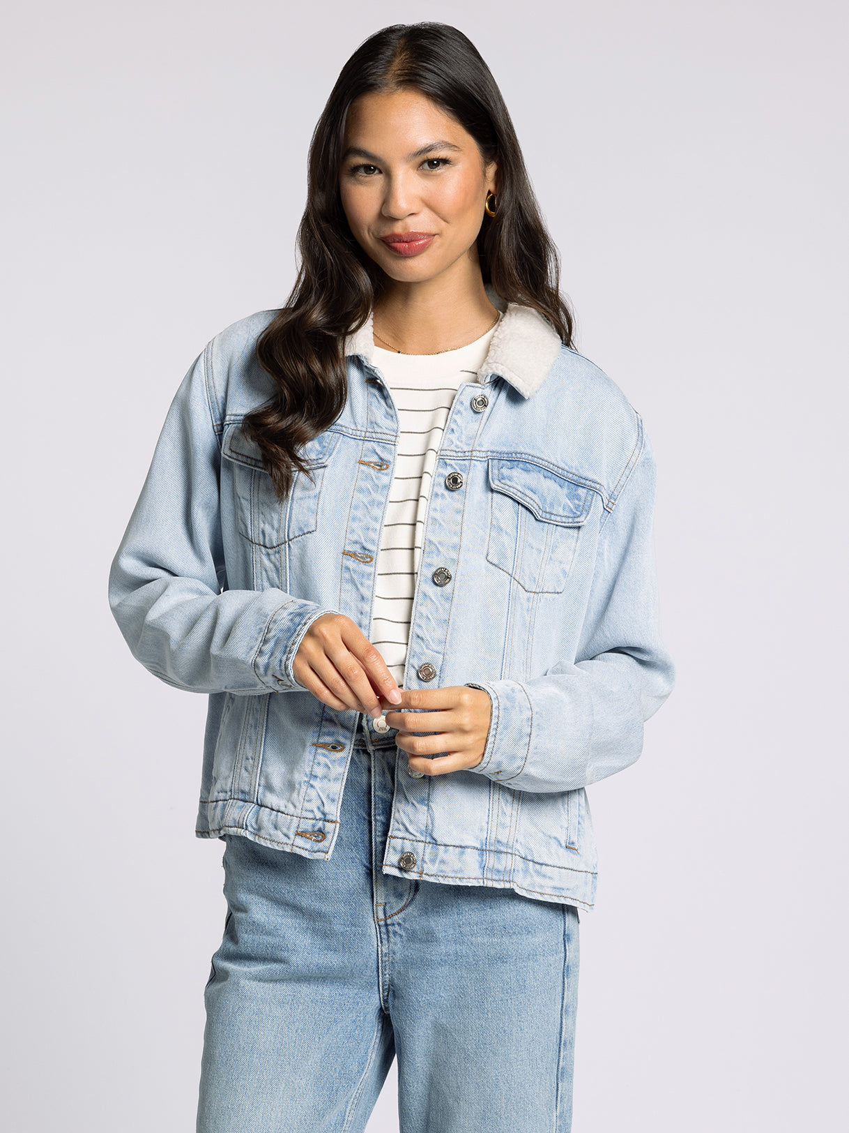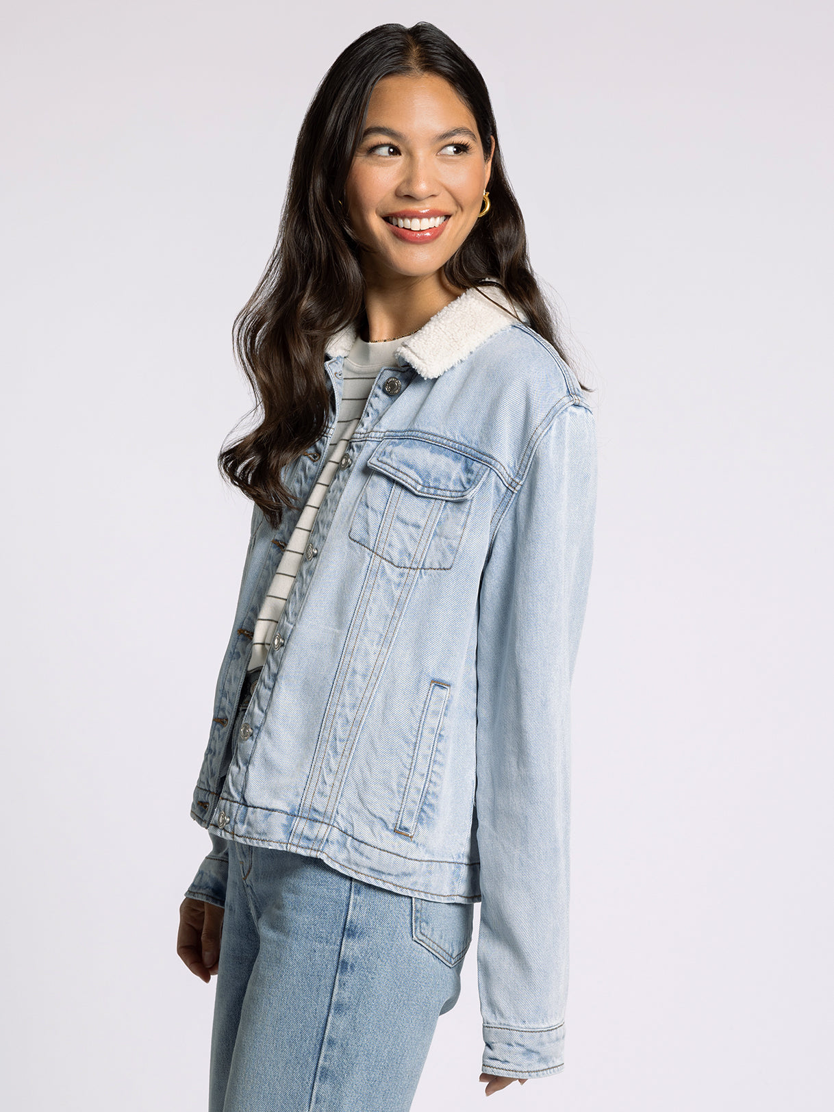So essential to your outerwear collection, this so-soft denim jacket is featured in the perfect washed denim with a sherpa collar for an extra touch of detail.