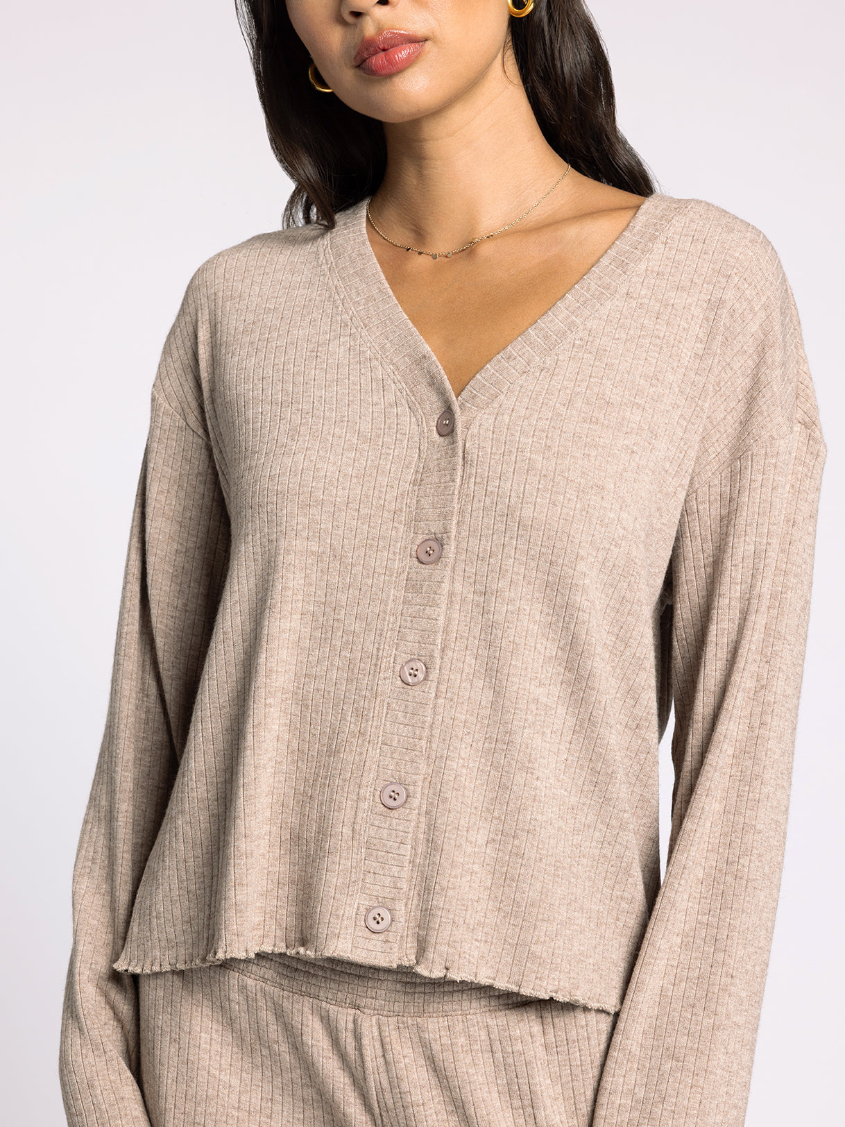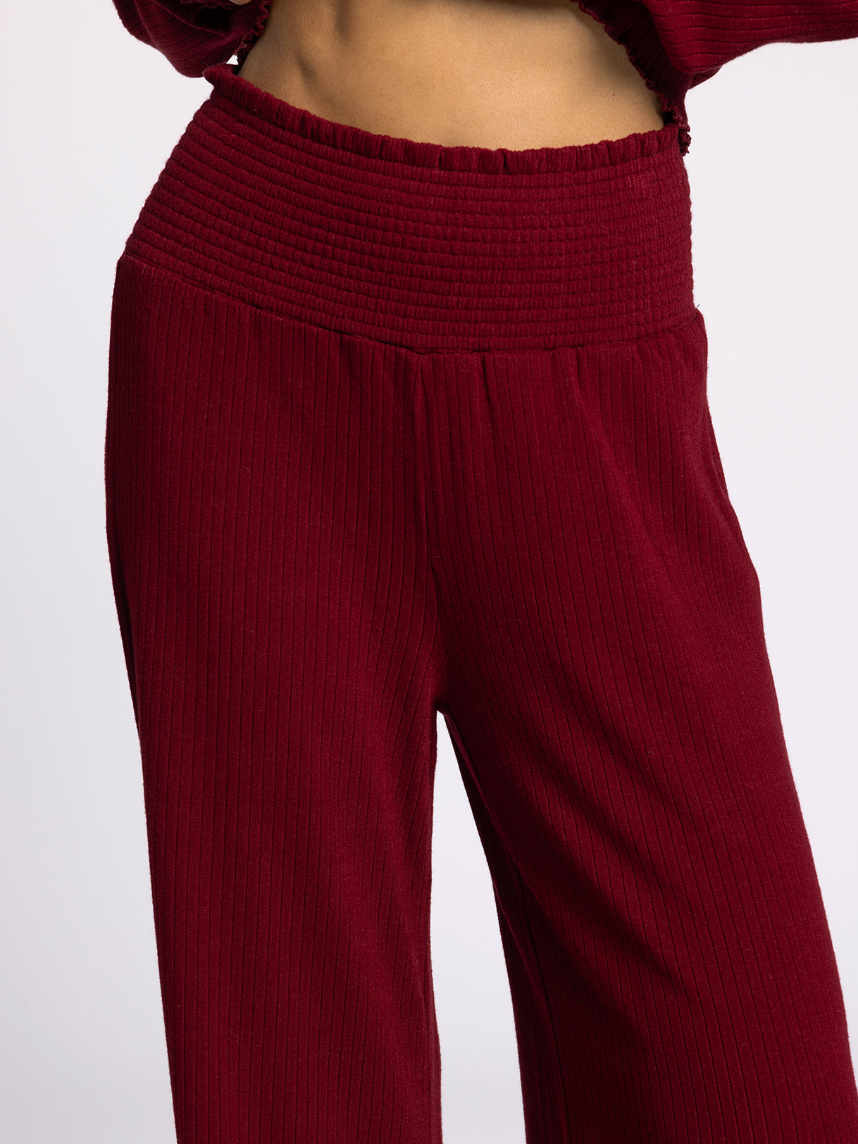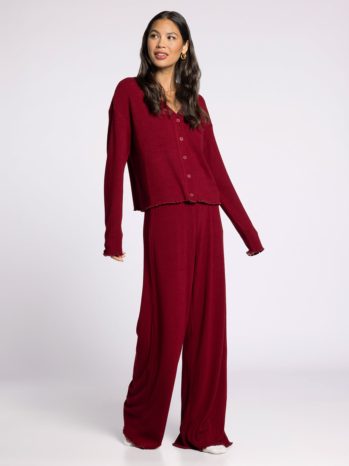 Lounge the day away in this comfy set, featuring a fitted V-neck long sleeve with relaxed, ribbed striped pants with elastic waist, made for taking it easy. Part of our exclusive holiday pajama collection!