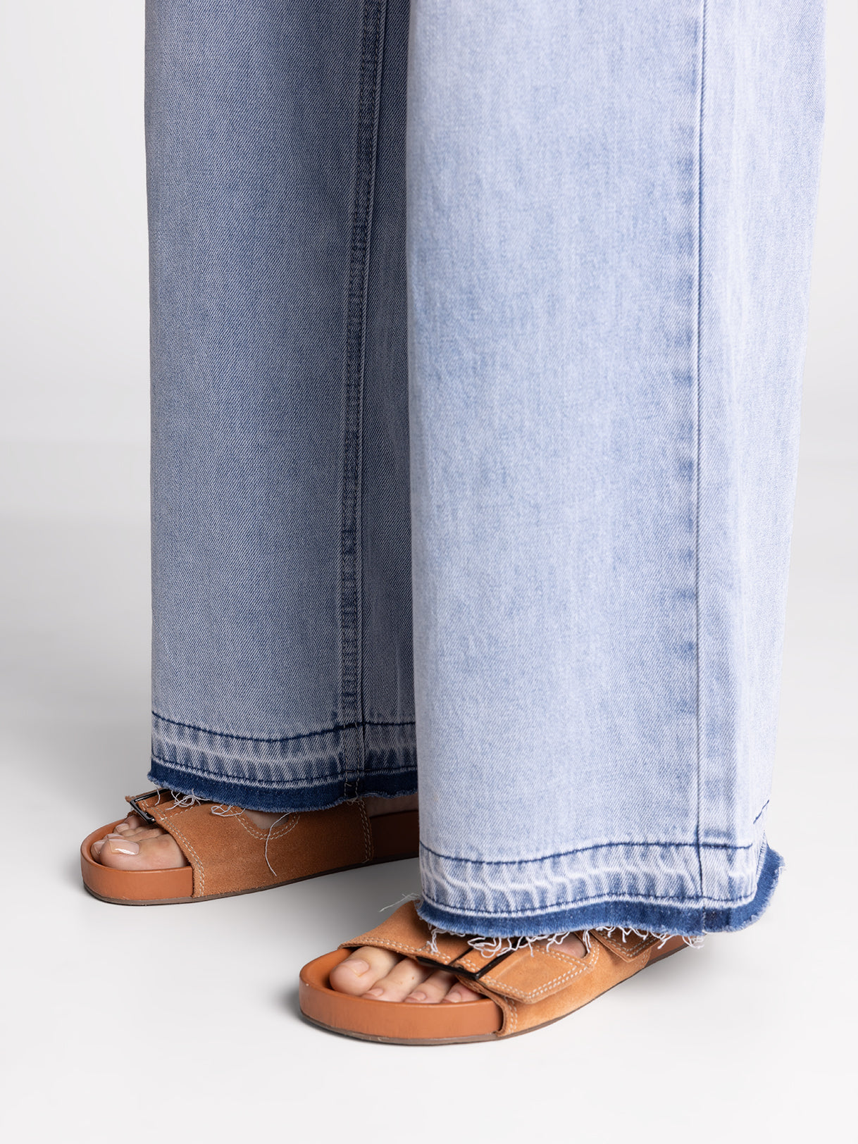 So perfect in a pull-on design, these super soft jeans are a mix of off-duty and elevated, featured in a wide leg silhouette, raw hem detailing and elastic waistband.
