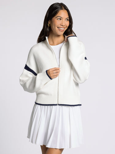 So soft and plush with a sporty twist, this sweater jacket is featured in a relaxed fit, drop shoulder and front zip closure with ribbed hem details.