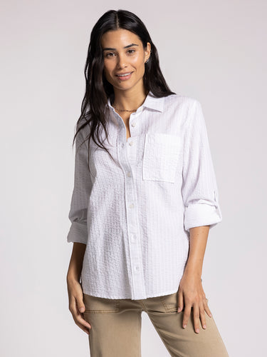 Crafted of our airy Signature cotton, this striped button-up shirt has an oversized fit for a more relaxed vibe. Traditional design details like a patch chest pocket, seersucker texture and a shirttail hem make it a wardrobe essential.