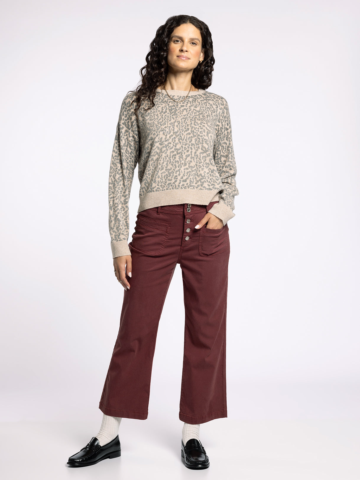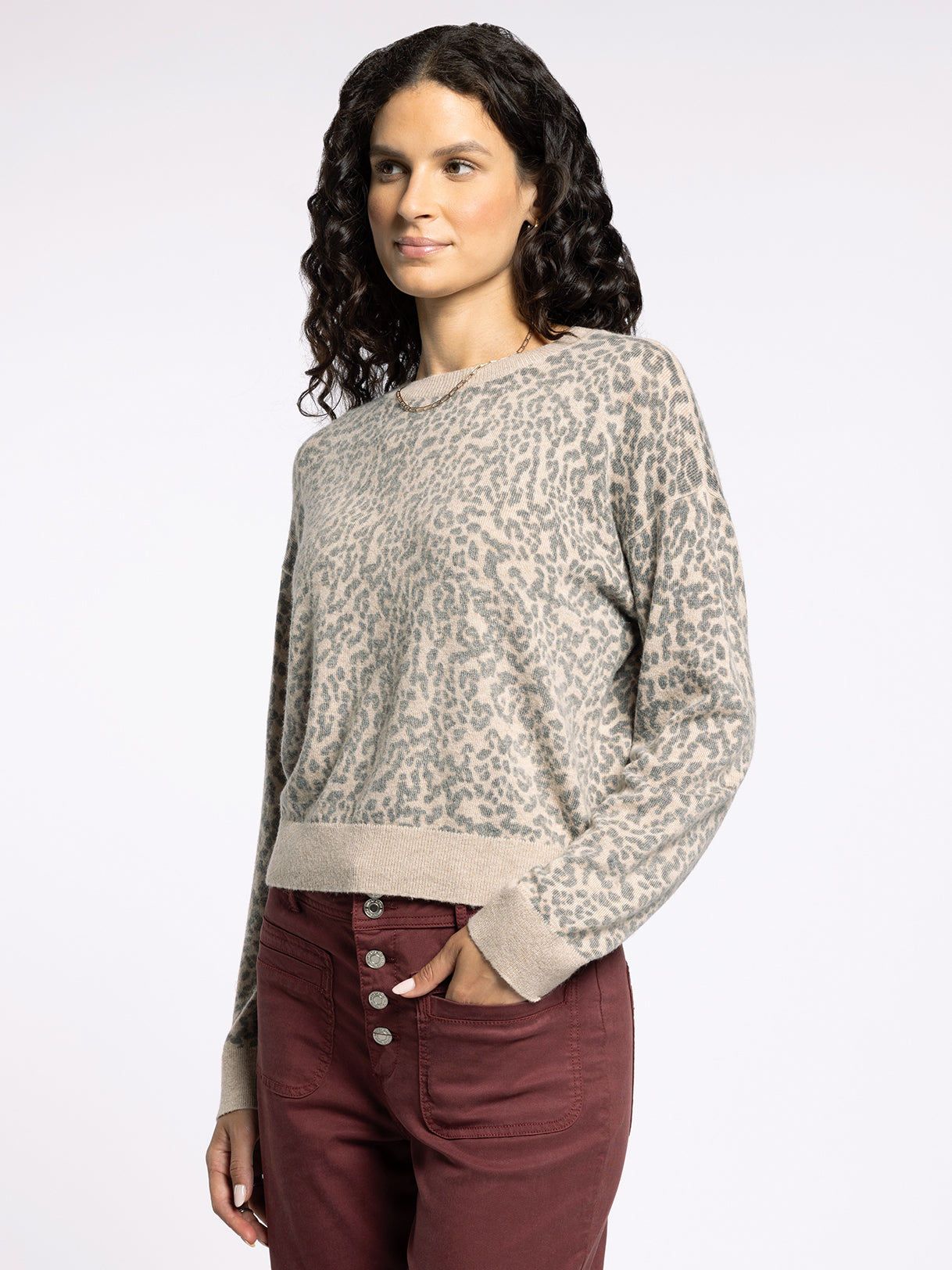 Totally timeless, now in print. This classic sweater is featured in a a super soft and fuzzy leopard print fabric with a crew neckline and ribbed hem details.
