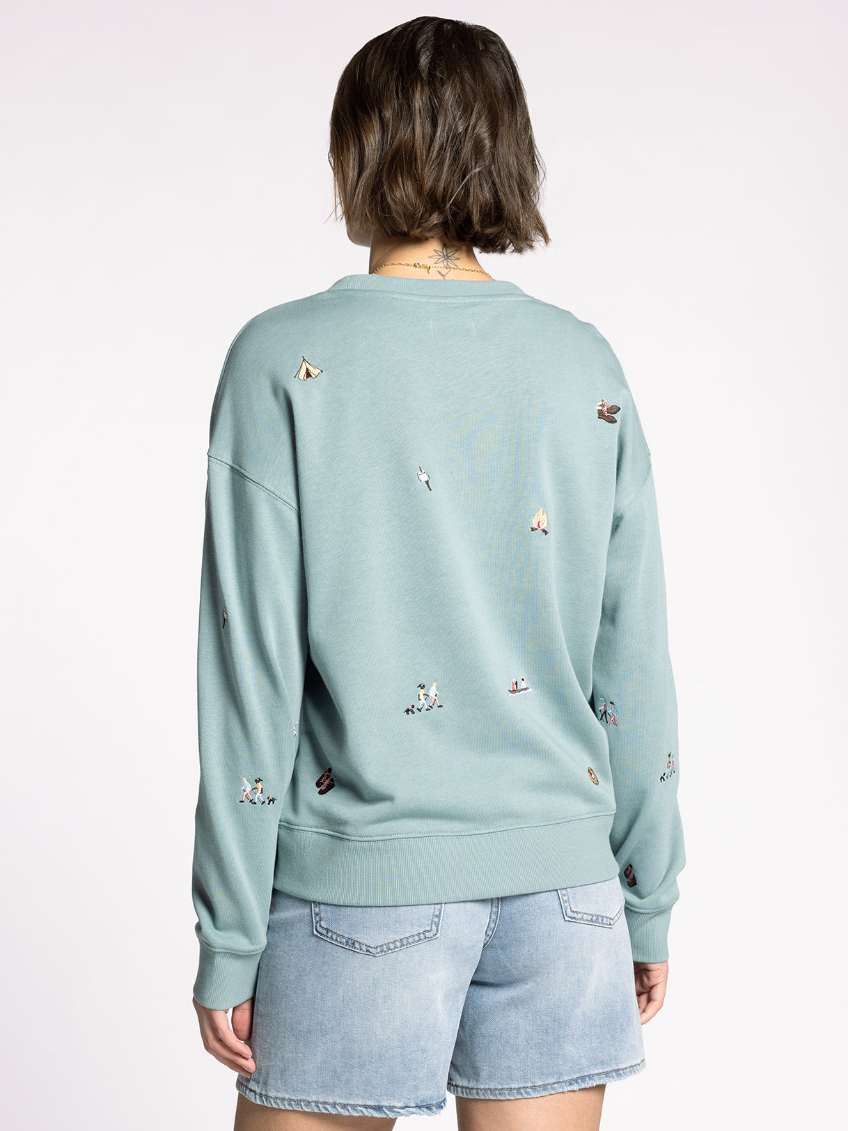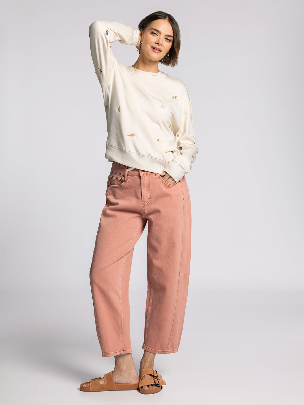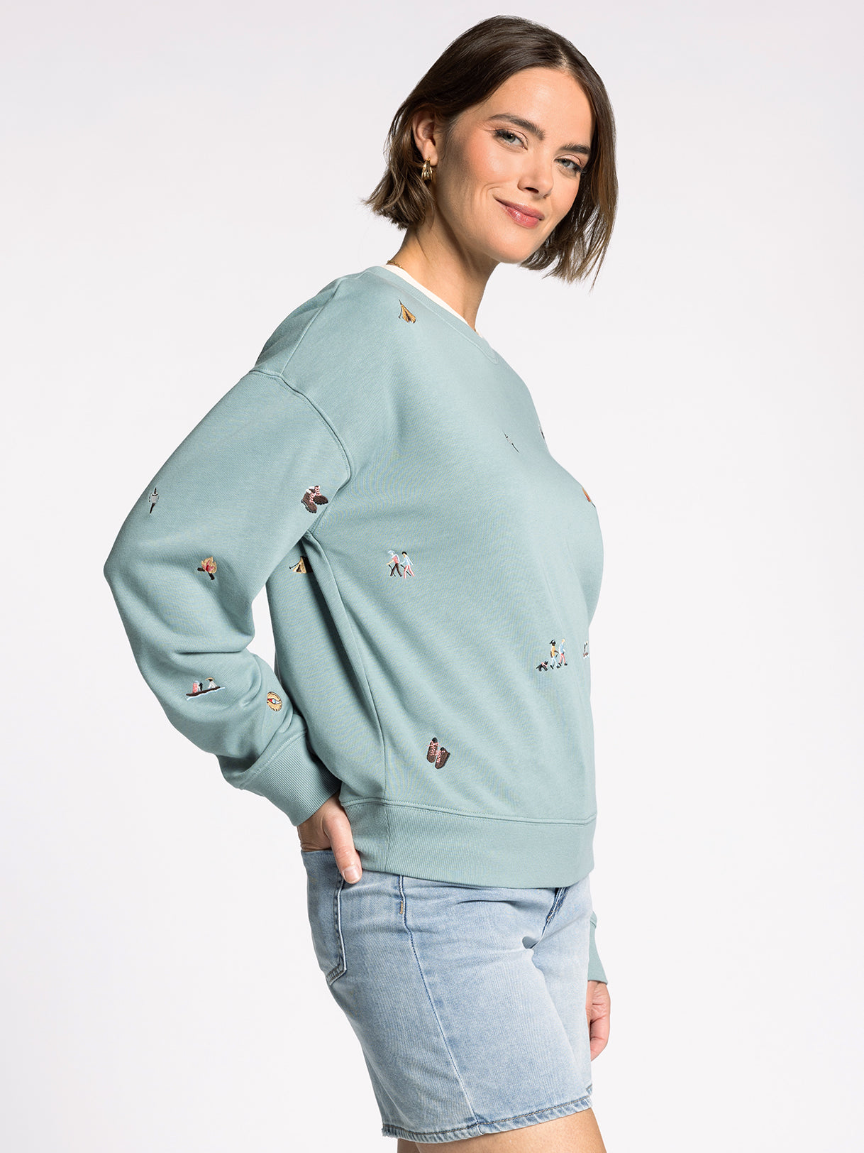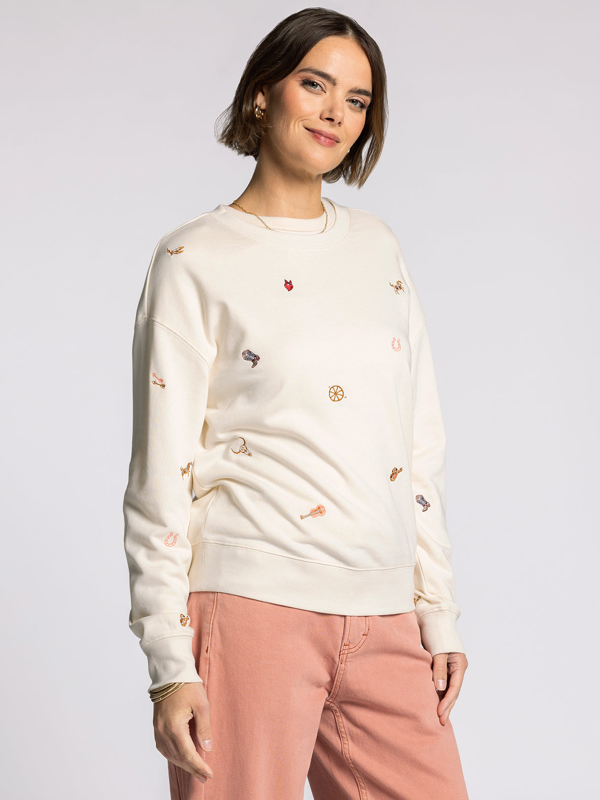 Your favorite go-to pullover now featured in a so-soft fabrication and slouchy silhouette with themed icons for a little flare.
