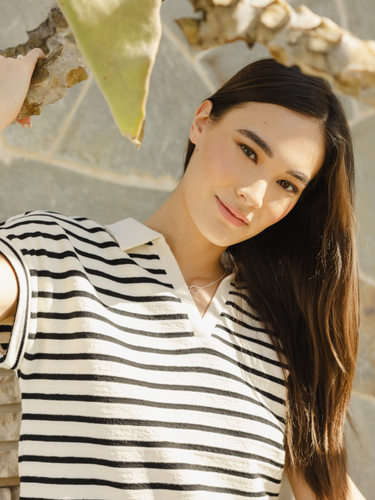So classic in stripes, this super soft 100% cotton top is featured in a collared v neckline and relaxed fit. Wear with the Jenna Skirt to make it a set.