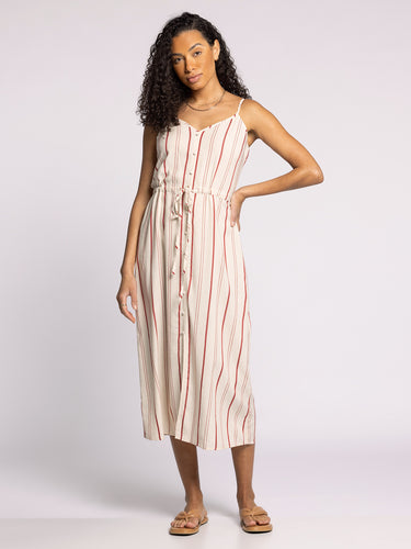 A forever essential from our summer collection, this stripped midi dress deserves a spot in every suitcase! Featuring a waist tie and adjustable spaghetti straps.