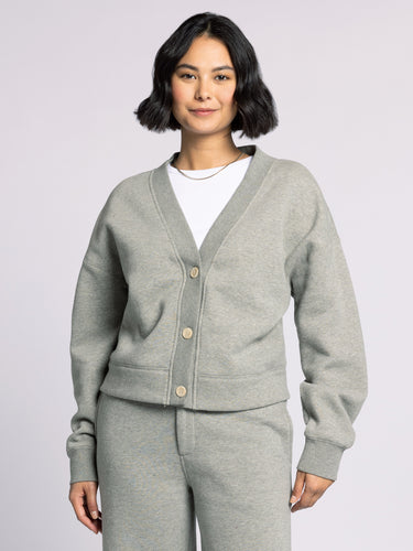 Totally timeless and cozy, this classic cardi is featured with a twist, in a warm brushed fleece and relaxed fit with a v-neckline and button-front closures.