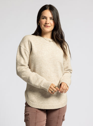 Keeping it soft yet stylish this season with the Flora Sweater! Featured in a relaxed, drop shoulder silhouette with ribbed cuff and dolphin hem detailing.