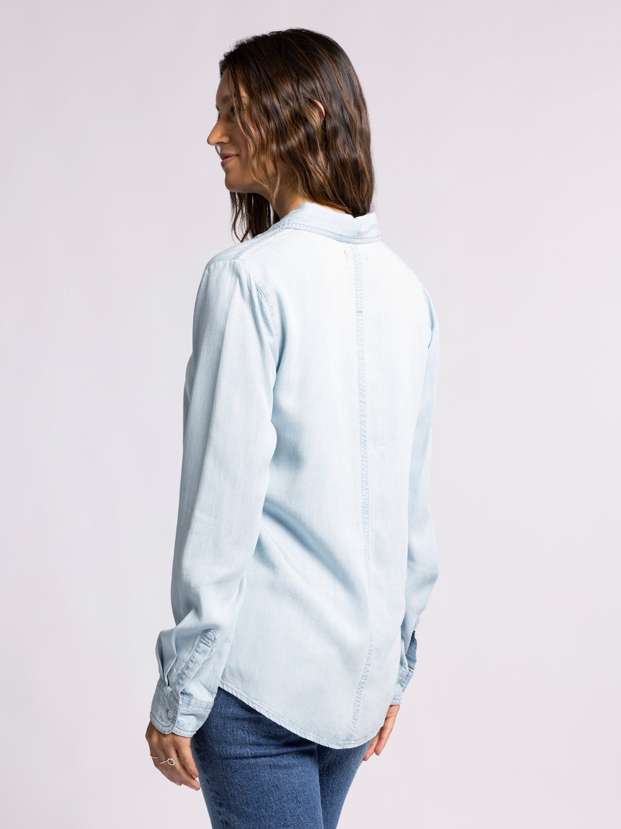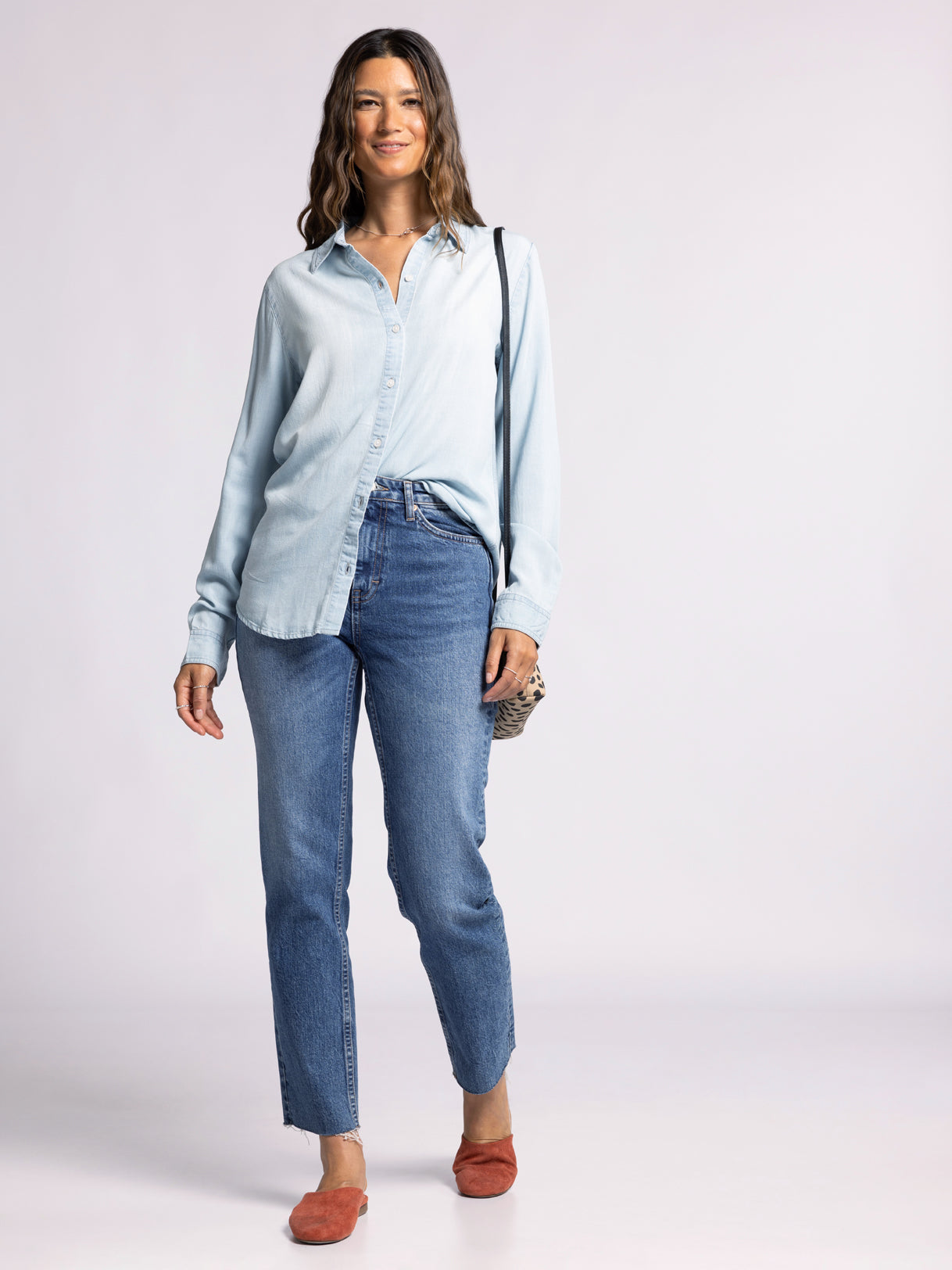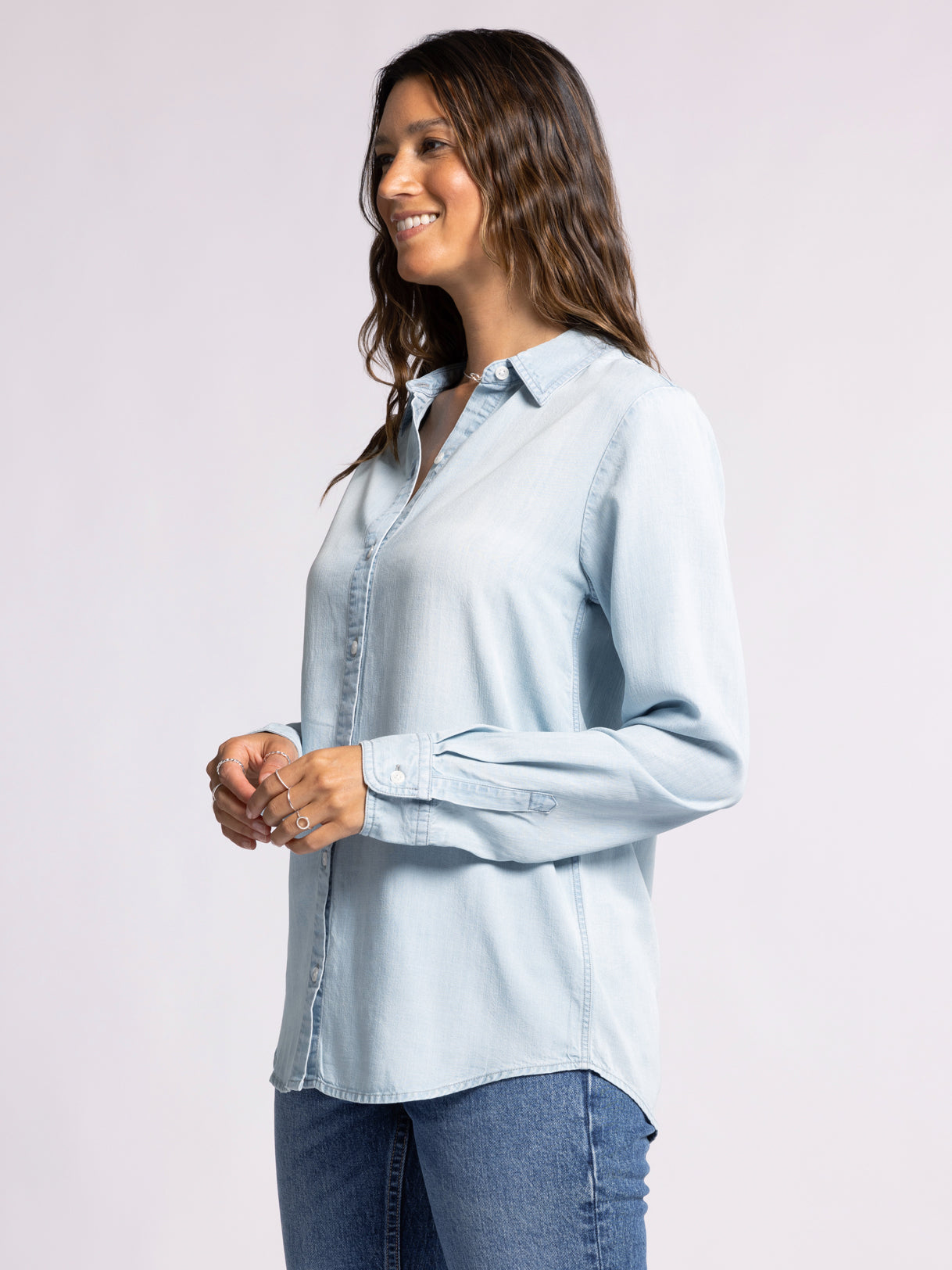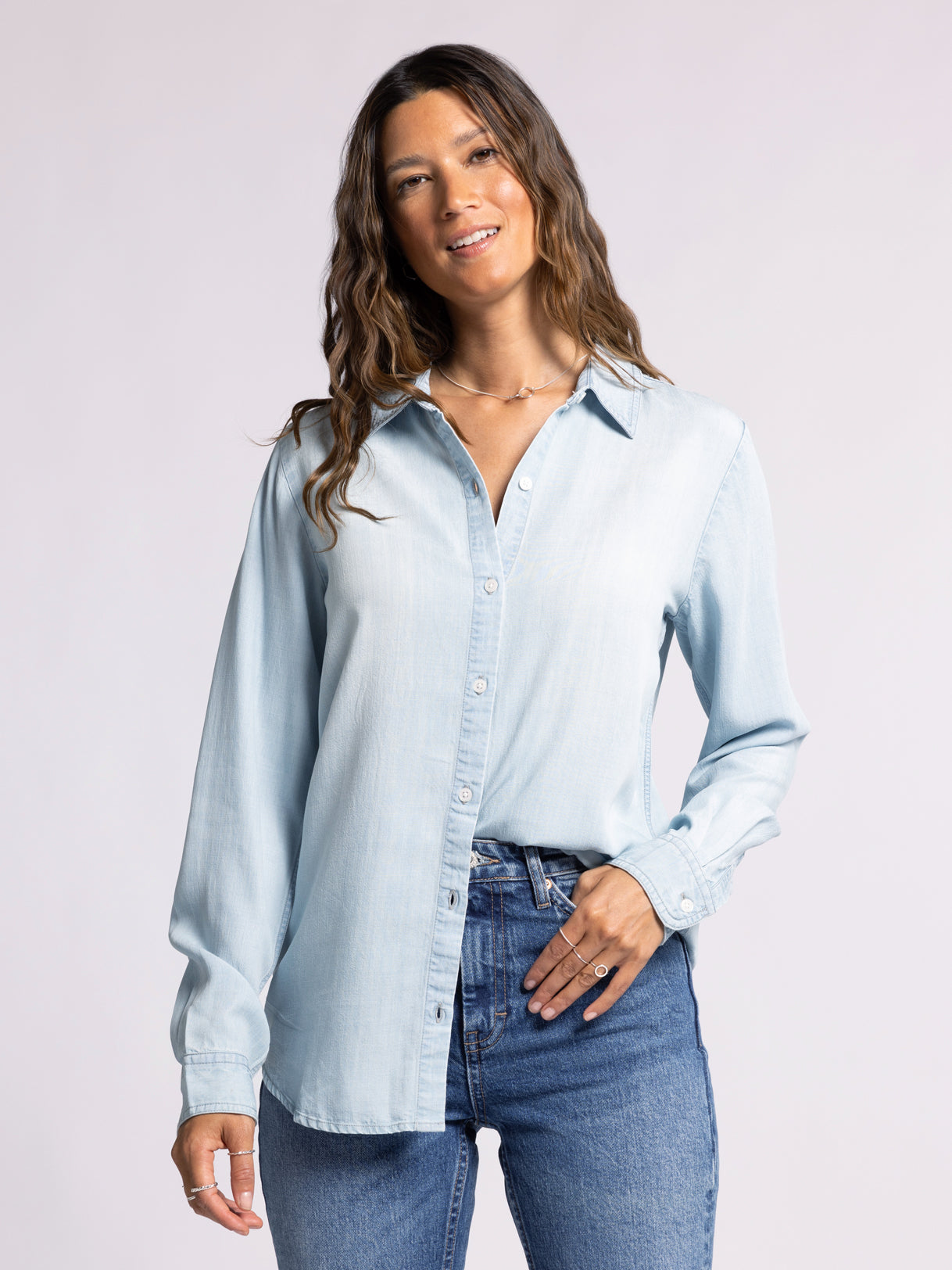 This essential chambray button up is the softest you have ever felt! Featuring button front closure and a relaxed fit.