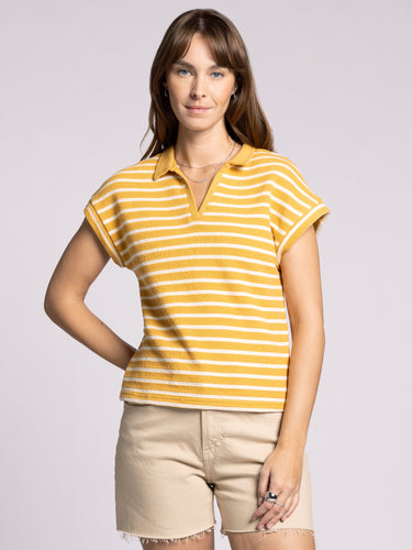 So classic in stripes, this super soft 100% cotton top is featured in a collared v neckline and relaxed fit. Wear with the Jenna Skirt to make it a set.