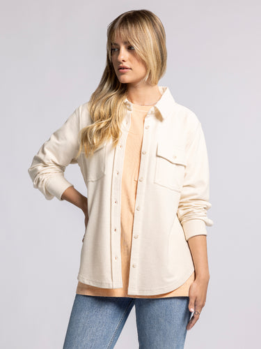 The perfect button down from our Fall collection, this classic shirt is featured in a so-soft cotton blend fabrication and oversized fit with dropped shoulders and a collared neckline.